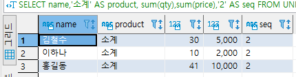 SELECT name,'소계' AS product, sum(qty),sum(price),'2' AS seq FROM UNIONTest Group By name--2번째 select