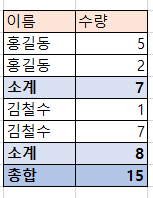 위와 같이 구해진 세 값을 ORDER BY 문을 통해 먼저 name을 기준으로 정렬 후, seq 구분자를 통해 '소계' 및 '총합'을 밑으로 내려준다.