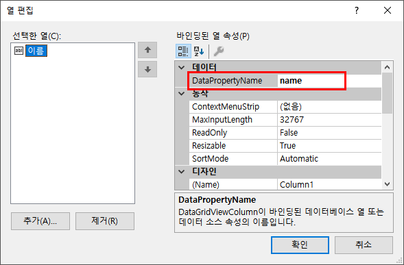 만약 DataGridView에 이미 컬럼이 추가 되어있다면, DataGridView의 컬럼 속성에서 DataPropertyName 과 DataTable의 컬럼명을 매치시켜서, 원하는 컬럼에 데이터들을 집어 넣을 수 있다.