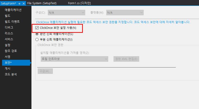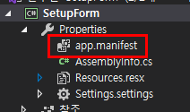 프로젝트의 Properties->보안->ClickOnce 보안 설정 사용을 체크하면 app.menifast가 보인다.