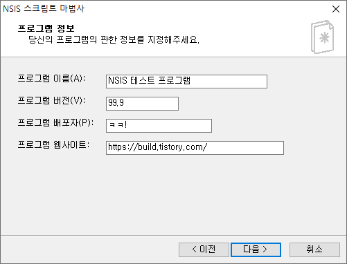 1-4. 프로그램 이름, 버전, 배포자, 웹사이트 정보 입력 후 다음.