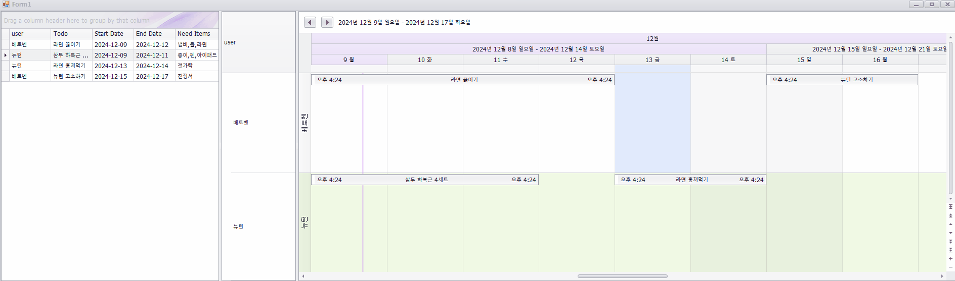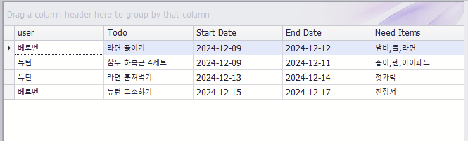 schDt.Rows.Add("베토벤", "라면 끓이기", DateTime.Now, DateTime.Now.AddDays(3), "냄비,물,라면");