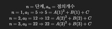 규칙성은 찾았지만, 수식화에 전혀 감이 잡히지 않아서 GPT한테 물어보니 이차수열의 식을 알려줬다.