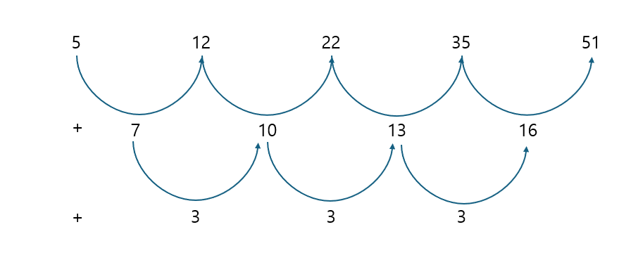 - 단계별로 늘어나는 점의 개수를 세어보면 공차의 수열이 등차수열을 이루는 것을 확인 할 수 있다.
