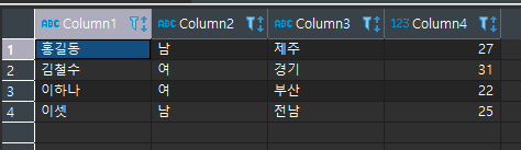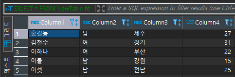 INSERT INTO NewTable (Column1,Column2,Column3,Column4) VALUES('이셋','남','전남',25)