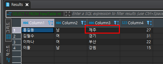 UPDATE NewTable SET Column3 = '제주' WHERE Column1 = '홍길동'