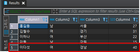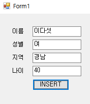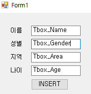 string query = $"INSERT INTO NewTable(Column1,Column2,Column3,Column4) VALUES('{name}','{gender}','{area}',{age})"; //DB서버로 전달할 쿼리